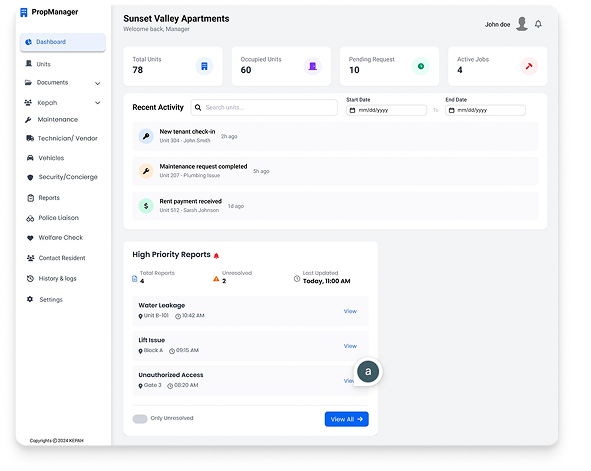 Main hub for daily operations: rent, alerts, residents, units, and tickets. Data-rich view tailored to active property.